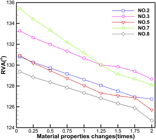 Line graph illustrating the relationship between material properties changes and RVA in degrees. The x-axis represents material properties changes from zero to two, while the y-axis shows RVA values from one hundred twenty-four to one hundred thirty-six. Five colored lines (blue, magenta, red, green, and gray) represent different sample numbers NO.2, NO.3, NO.5, NO.7, and NO.8. Each line depicts a downward trend, with varying starting points and slopes.
