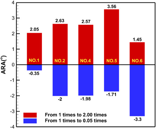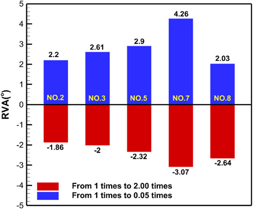 Bar chart showing relative values labeled NO.2, NO.3, NO.5, NO.7, and NO.8 on the x-axis, with positive blue and negative red segments. The y-axis is labeled RVA (degrees), ranging from -5 to 5. Values for each set are presented, with blue sections ranging from 2.03 to 4.26 and red sections ranging from -1.86 to -3.07. The legend indicates blue represents values from 1 to 0.05 times and red from 1 to 2 times.