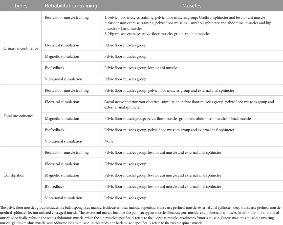 After a thorough literature review, we summarized the muscles targeted by five rehabilitation training methods for urinary and defecation dysfunction, which include the pelvic floor muscles, core abdominal muscles, and core hip muscles (Table 1).