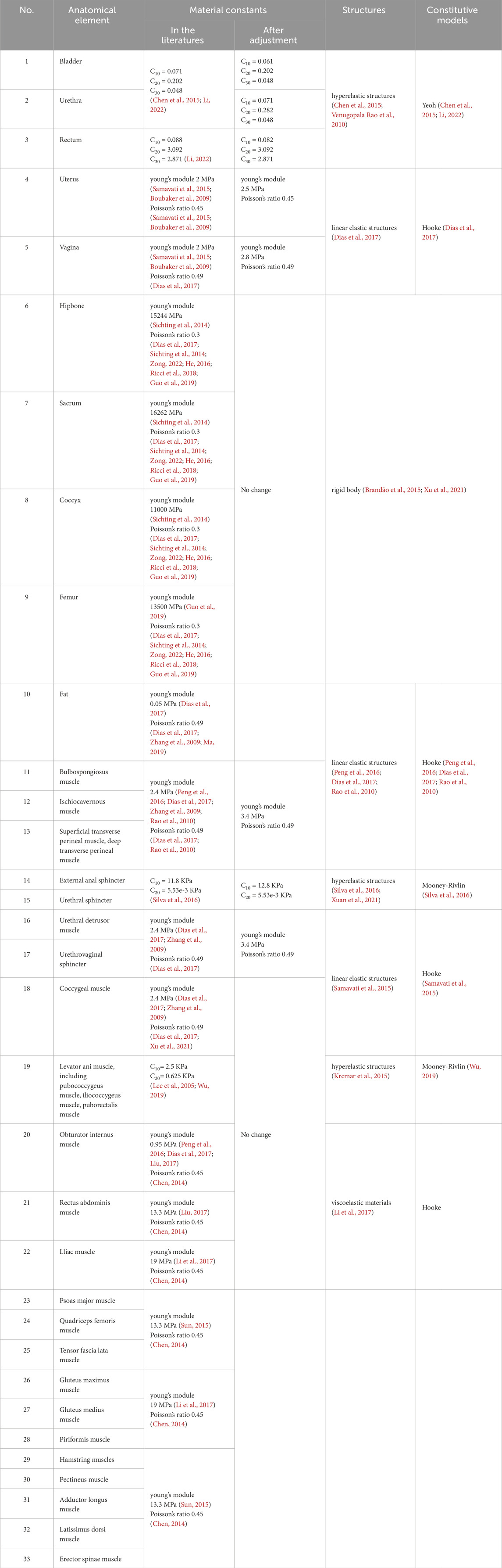 When setting material properties for the model, we reviewed existing material data from previous studies (Peng et al., 2016; Dias et al., 2017; Brandão et al., 2015; Chen et al., 2015; Li, 2022; Venugopala Rao et al., 2010; Xu et al., 2021; Chen, 2014; Samavati et al., 2015; Boubaker et al., 2009; Sichting et al., 2014; Zong, 2022; He, 2016; Ricci et al., 2018; Guo et al., 2019; Zhang et al., 2009; Ma, 2019; Rao et al., 2010; Silva et al., 2016; Xuan et al., 2021; Lee et al., 2005; Wu, 2019; Krcmar et al., 2015; Liu, 2017; Sun, 2015; Li et al., 2017) and summarized the recognized mechanical parameters reported in the literature (Table 2). Studies have shown differences in the mechanical properties of pelvic soft tissues between elderly and younger populations, with potential variations in material properties (Chantereau et al., 2014). Based on these findings, we made gradual adjustments to the material properties of the pelvic floor muscles to reflect the expected biomechanical changes with aging. These adjustments were made incrementally until the differences between the finite element model and dynamic MRI measurements of ARA, RVA, and waist circumference were within 10%. This process ensured that the model accurately simulated the physiological changes that occur with aging.