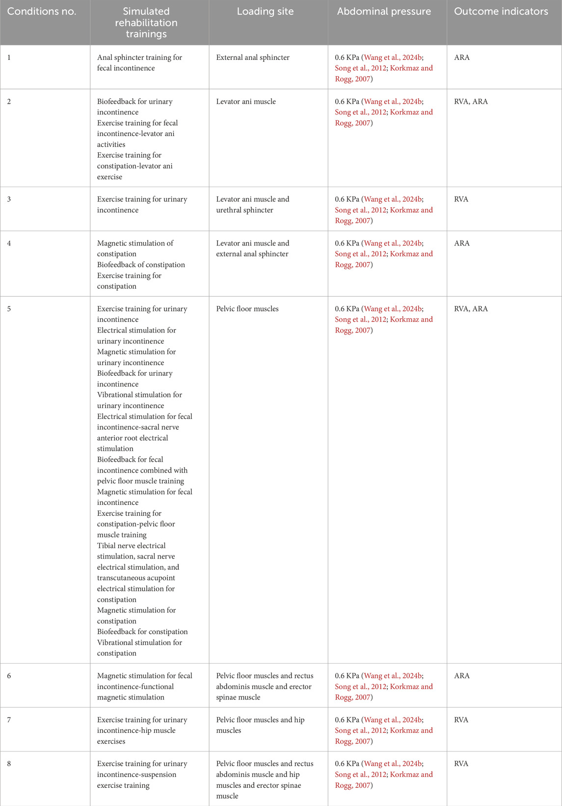 Under different simulation plans, this study proportionally adjusted the material properties of muscles to theoretically simulate changes in muscle function after different rehabilitation training methods (Peng et al., 2016; Dias et al., 2017; Brandão et al., 2015). Specifically, the material constants of the muscles involved in the rehabilitation training were adjusted to 2 times, 1.75 times, 1.5 times, 1.25 times, 1 time, 0.75 times, 0.5 times, 0.25 times, and 0.05 times, simulating muscle capacity changes of +100%, +75%, +50%, +25%, normal, −25%, −50%, −75%, and −95%, respectively. The elastic modulus of pelvic floor and related muscles was varied from 0.05 times to 2.0 times of the baseline values to represent a wide spectrum of physiological conditions ranging from severe impairment to strengthening. This approach has been previously adopted in computational modeling studies. For example, Dias et al. (2017) applied multiplicative factors from 0.05 times to 2.0 times to muscle material properties in their finite element analysis of pelvic floor dynamics during high-impact activities, thereby providing a precedent for this parameter variation strategy.