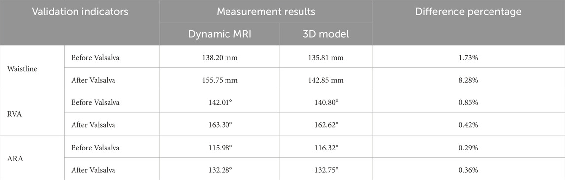 Figure 4 illustrates the validation of the model through dynamic MRI measurements during the Valsalva maneuver. These images demonstrate the anatomical changes induced by intra-abdominal pressure and provide quantitative references for validating the simulation model’s accuracy. Assessments of using data obtained from dynamic MRI of pelvic floor changes along the midsagittal plane in model during the Valsalva maneuver showed that the relative changes in abdominal waistline and the differences in RVA and ARA were within 8.28% (Table 4).