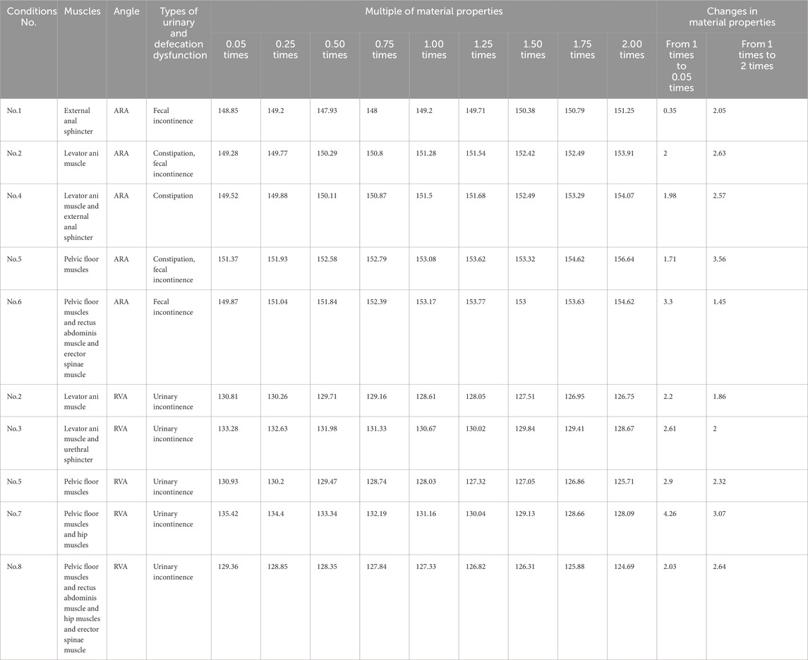 The relationship between rehabilitation training and the ability to control urinary and fecal functions was primarily quantified by comparing the differences in RVA and ARA using different material properties. This helped in identifying which muscles showed the greatest improvement in urinary and defecation control ability after rehabilitation training (Table 3).
