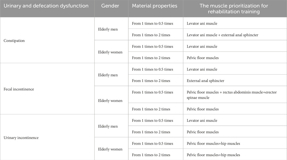 For muscle rehabilitation training for elderly people with different types of urinary and defecation dysfunction, a “one size fits all” strategy should not be used. Personalization is a extremely important issue (Pinto et al., 2020; Davies et al., 2020; Sarrió et al., 2021; Suhonen et al., 2022). Taking constipation as an example, strategies based on individual risk factors of elderly constipation patients have been proven to reduce the occurrence of constipation (Huang et al., 2015). However, the muscle prioritization for the rehabilitation of elderly individuals with urinary and defecation dysfunction is still not fully understood. It is necessary to explore the quantitative relationship between different rehabilitation training methods and urinary and defecation control ability, in order to provide guidance for personalized rehabilitation training practices.