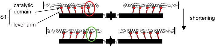 Figure 1. Cartoon representing the sarcomere and its shortening induced by the working stroke of myosin motors. Reciprocal sliding between the actin filaments (white), originating from the Z-line at the sarcomere extremities, and the myosin filaments (black), bound to the M-line at the sarcomere center and carrying two bipolar arrays of myosin motors (represented by their motor domains or sub-fragment 1 S1, red; all actin-attached for simplicity), is powered by the working stroke of the actin-attached myosin motor (red to green oval). The working stroke consists of inter-domain tilting of the lever arm about the catalytic domain, which remains firmly attached to the actin site (gray).