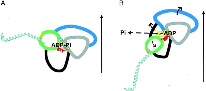 Figure 2. Schematic drawing of the subdomains within the myosin catalytic domain and their reciprocal structural changes accompanying the working stroke transition. The four subdomains identified by different colors are the N-terminal (black), the upper 50-kDa subdomain (blue), the lower 50-kDa subdomain (gray), and the converter (green). Two (yellow and red) of the structural elements joining the subdomains are visible. The α-helix constituting the lever arm is cyan. The structures are obtained from the scallop myosin: (A) S1 complexed with VO43-, representing the pre-working stroke state. (B) Nucleotide-free S1, representing the end-of-stroke state. The vertical arrows indicate the approximate direction of the actin filament axis. The orientation of the two structures is defined by conserving the orientation of the lower 50-kDa relative to actin. The release of Pi is indicated with the dashed arrow. The exit direction is an open question, and more recent evidence (Llinas et al., 2015) indicates that it is opposite (backdoor) to what is shown here. The direction of the movement of the subdomains in the transition between the two states is shown by the short continuous arrows. The ∼70° change in the orientation of the converter is turned into ∼11 nm axial movement by the length of the lever arm (modified from Figure 2B by Houdusse et al. (2000). Copyright (2000) National Academy of Sciences, United States).