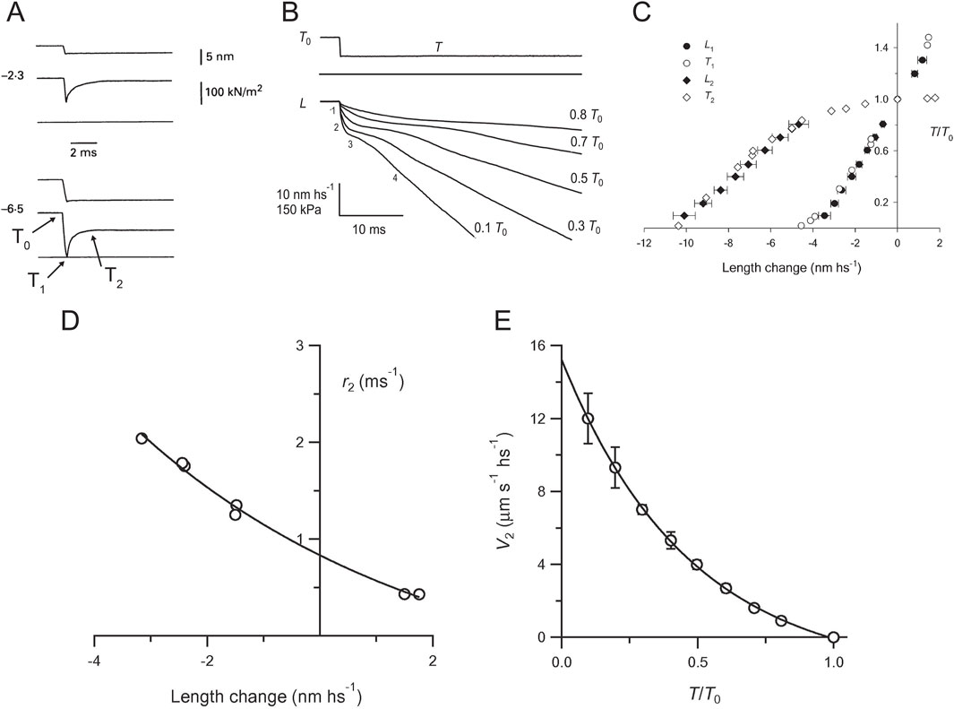 Figure 3. Force and velocity transients. (A) Early components of force transients (middle trace in each panel) elicited by a step release (upper trace) superimposed on the steady force of the isometric contraction (T0) of a single fiber from frog skeletal muscle. Release amplitude per half-sarcomere (hs), 2.3 nm (upper panel) and 6.5 nm (lower panel). The lower horizontal line is the baseline for force. (B) Isotonic velocity transients following steps in force superimposed on the isometric force (T0) of a single fiber from frog skeletal muscle. Upper trace, stepwise decrease to a force T = 0.5 T0; middle trace, force baseline; lower traces, change in half-sarcomere length (L) corresponding to steps to the forces indicated by the figures on the right. The figures on the left of the 0.1 T0 trace show the phases of the transient. Reproduced from Figure 1 of Piazzesi et al. (2002) with permission. (C) Comparison of L1 (filled circles) and L2 (filled diamonds) relations from velocity transients with T1 (open circles) and T2 (open diamonds) relations from force transients. Reproduced from Figure 4 of Piazzesi et al. (2002) with permission. (D) Rate of early force recovery (r2) versus step amplitude. The line is obtained by fitting the r2 data points with an exponential. Reproduced from Figure 3C of Piazzesi and Lombardi (1995). (E) Relation between the initial shortening velocity of phase 2 (V2) and force (T/T0). The line is an exponential fit to the data. Reproduced from Figure 3A of Piazzesi et al. (2002).