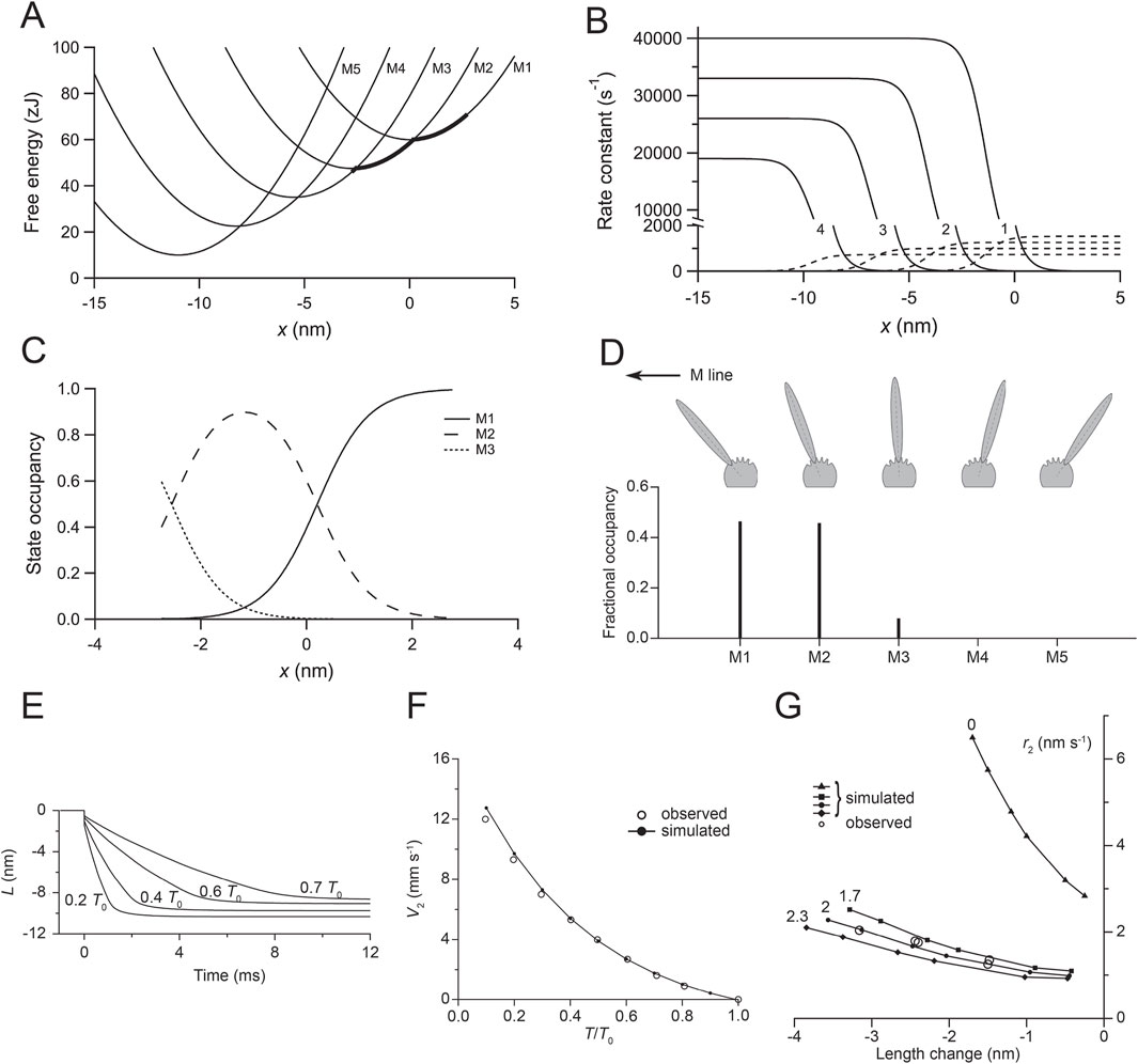 Figure 4. Relevant parameters of the kinetic model of the working stroke. (A) Free energy diagram of the myosin motor states (M1–M5) as a function of the relative position (x) between the myosin motor and the actin monomer. x is set to 0 for the minimum free energy of an attached motor in the state M1. The free energy minima of the various states are separated by a distance z (the step size) = 2.75 nm so that the working stroke of 11 nm is preserved with a number of structural transitions = 4. The thick line marks the axial distribution of motors during the isometric contraction. (B) Functions expressing the x-dependence of the forward (continuous lines) and backward (dashed lines) transitions. The figures indicate the order of the transition. (C) Fractional occupancy of the various states as a function of x during isometric contraction. (D) Sketch of the conformation of the five states (M1–M5) of the myosin motor characterized by orientations of the lever arm separated by angles corresponding to an axial displacement of 2.75 nm of the tip of the lever under zero force. The lower panel shows the fractional occupancy of the different states in isometric contraction. (E) Simulated velocity transients following force decreases to the values indicated by the figures close to the traces. (F) Filled circles and continuous line: simulated V2-T/T0 relation; open circles: experimental data from Figure 3E. (G) Filled symbols and lines: simulated relations between r2 and the size of the step release in the absence of filament compliance (triangles) and in the presence of 1.7 nm/T0 (squares), 2 nm/T0 (filled circles), and 2.3 nm/T0 (diamonds) filament compliance. Open circles are experimental data from Figure 3D. Panels A–C, reproduced from Figure A1 of Piazzesi et al. (2014); panel D, reproduced from Figure 4 of Fusi et al. (2014); panels E and F, reproduced from Figure 4 of Piazzesi et al. (2014); panel G, reproduced from Figure 5D of Piazzesi et al. (2014).