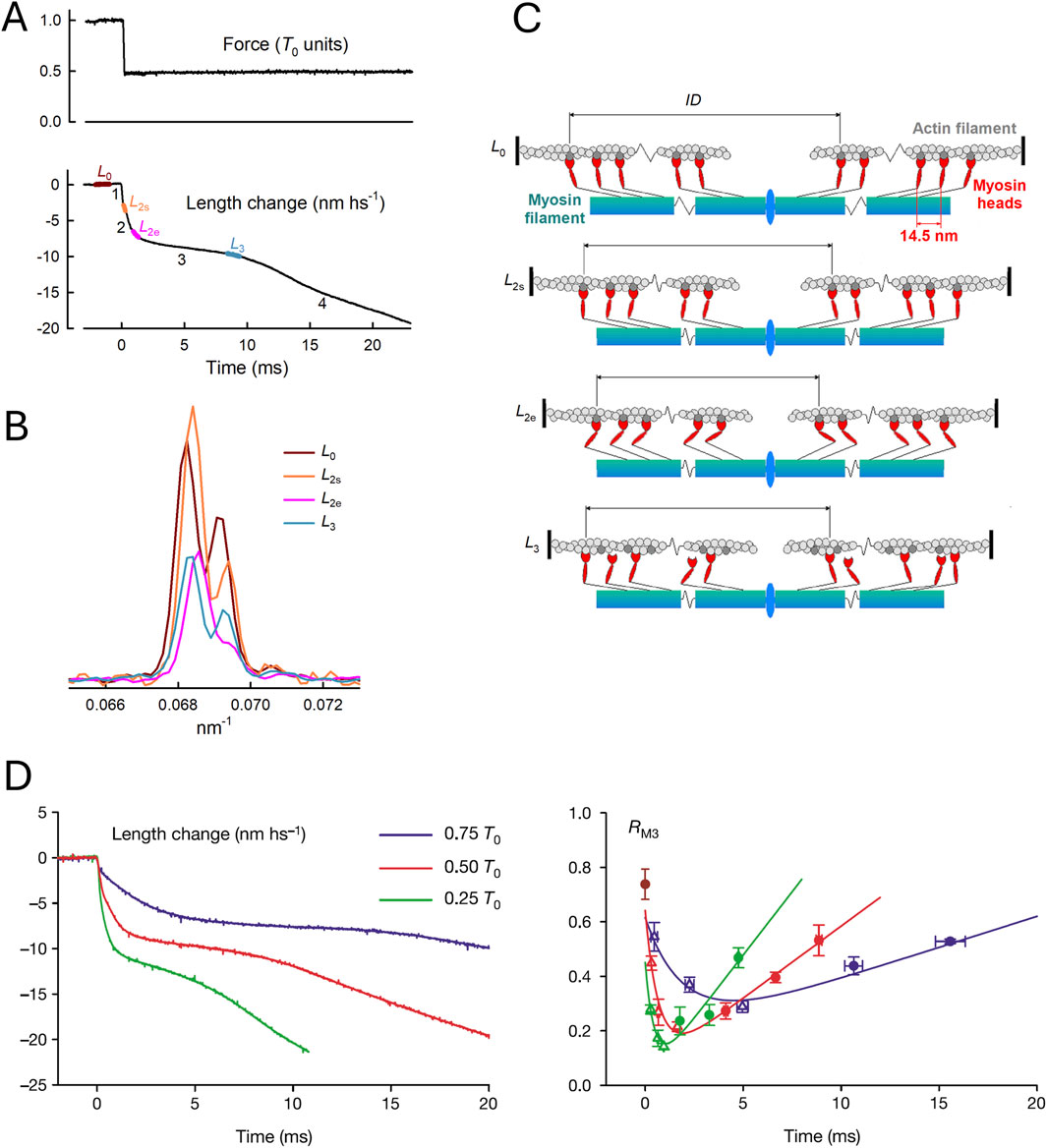 Figure 5. Motion of myosin motors during the velocity transient. (A) Force change normalized by isometric force T0 and length change in nm/hs. (B) Axial X-ray intensity distribution in the region of the M3 reflection recorded at the BioCAT beamline of the APS Synchrotron (Argonne, United States). Colors denote X-ray exposure periods, as shown in (A) brown, L0; orange, L2s; magenta, L2e; and cyan, L3. (C) Structural organization of myosin motors in the muscle sarcomere at each X-ray exposure, as predicted by the M3 interference fine structure in (B). (A–C) From Figure 1 of Reconditi et al. (2004). (D) Superimposed half-sarcomere shortenings (left panel) following force decreases to three different values (identified by the color code in the inset) and intensity ratio (RM3, right panel) of the higher over the lower angle component of the M3 intensity distribution. From Figure 2A, B of Reconditi et al. (2004).