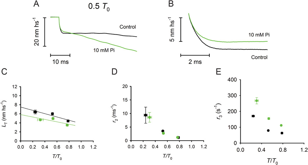 Figure 6. Effect of [Pi] on the isotonic velocity transient. (A) Superimposed isotonic velocity transients following a force step to 0.5 T0 in control (black) and 10 mM Pi (green). (B) Superimposed phase 2 of the velocity transients in control (black) and in 10 mM Pi (green), which were obtained after subtracting phase-1 and phase-3 shortenings. (C) Relation between the shortening accounted for by the working stroke (LT) and the force expressed in relative units T/T0 in control (black) and 10 mM Pi (green). (D) Dependence of the rate constant of the working stroke (r2) on T/T0 in control (black) and 10 mM Pi (green). (E) Dependence of the rate of phase 3 (r3) on T/T0 in control (black) and 10 mM Pi (green). Reproduced from Figures 2, 3 of Caremani et al. (2013) with permission.