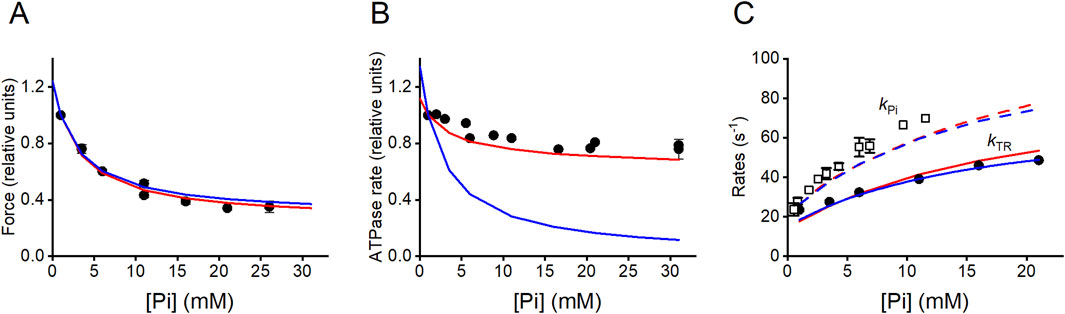 Figure 7. Effects of [Pi] on the isometric force, ATPase rate, and rate of force change during initial force increase and following a Pi jump. (A) Pi-dependence of isometric force (relative to the force in the control solution, 1 mM Pi). Filled circles, data from Figures 1F, 6A of Caremani et al. (2008). Model predictions: blue line, Scheme 1; red line, Scheme 2. (B) Pi-dependence of the ATPase rate: filled circles, pooled data from Bowater and Sleep (1988), Potma et al. (1995) and Potma and Stienen (1996). Model predictions: blue line, Scheme 1; red line, Scheme 2. Values relative to those in the control solution. (C) Pi-dependences of kTR (the rate of force redevelopment from a large release bringing the force to 0) and kPi (the rate of force decrease following a Pi jump). Filled circles, observed kTR relation from Figure 6C of Caremani et al. (2008). Model prediction: blue continuous line, Scheme 1; red continuous line, Scheme 2. Open squares, observed kPi relation from Figure 6 of Dantzig et al. (1992). Model prediction: blue dashed line, Scheme 1; red dashed line, Scheme 2. Modified from Linari et al. (2010).