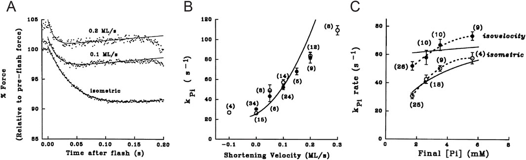 Figure 8. Pi transients in isometric contraction and during isovelocity shortening. (A) Force responses to Pi jump (points) imposed in isometric contraction and during shortening at the velocities (ML/s means fiber length/s) indicated on the traces. Records were interpolated by the sum of an exponential and a straight line (continuous line). (B) Relation of kPi versus shortening velocity. (C) Relation between kPi and final Pi concentration in isometric contraction (open circles) and during shortening at 0.1 fiber length/s (filled circles). Dashed lines interpolated to data. Continuous lines in (B–C) are the predictions of the model reported in Scheme 1 (reproduced from Figures 3, 4, 8 in Homsher et al. (1997) with permission).