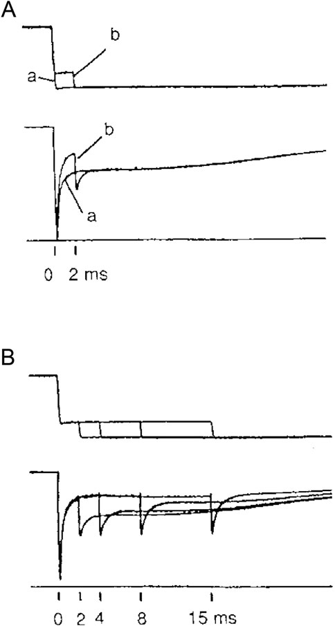 Figure 9. Force transient elicited by a step release imposed at different times following a conditioning step. (A) Superimposed records of force responses (lower traces) to (a) a single step release of 7 nm per half-sarcomere (upper traces) and to (b) a step of 2 nm delivered 2 ms after a conditioning step of 5 nm. (B) Superimposed records of force responses to test steps of 2 nm delivered 2, 4, 8, and 15 ms after the conditioning step of 5 nm. Single muscle fiber from Rana esculenta tetanically stimulated at 2.1 μm sarcomere length and 4 °C. Half-sarcomere length changes measured in a selected fiber segment measuring ∼1 mm in length. From Figure 1 in Lombardi et al. (1992).