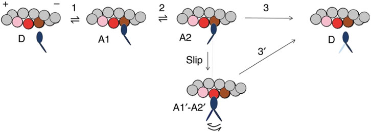 Figure 10. Simplified model with myosin slipping (Reaction Scheme 3). Kinetic scheme with three states of the myosin motor (blue): D, detached state; A1 and A2, low- and high-force states, respectively, attached to an actin monomer (brown). During shortening, the motor attached in the A2 state can slip to the next actin monomer farther from the center of the sarcomere (red) within the same ATPase cycle. The probability of a second slipping to the pink monomer is limited to 1/10 of that of the first slipping. From Figure 4 of Pertici et al. (2018).