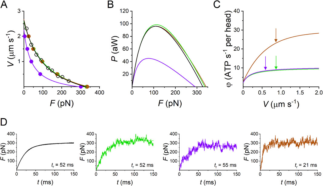 Reaction Scheme 4 is unique in allowing simulation of the force and velocity transients elicited in response to a step in length or load that synchronizes the execution of the working stroke and its dependence on mechanical and biochemical conditions. As already discussed, the presence of a significant compliance in the myofilaments, functionally in series with the motor array in each half-sarcomere, complicates the use of the rate of quick force recovery as a constraint for modeling the working stroke kinetics (Piazzesi et al., 2014). Instead, phase-2 shortening elicited by a stepwise decrease in force (Figures 3B, 5D) directly provides information on the load dependence of the rate and the size of the working stroke, and the following phase-3 pause provides information on the kinetics of the events leading to working stroke regeneration. Reaction Scheme 4 can satisfactorily fit the isotonic velocity transient (Figure 14B: black, experiment; green, model), providing a direct demonstration of the role of slipping in the rapid regeneration of the working stroke, which is the condition for the maximization of the power during the more physiological steady shortening. Following the removal of steps 8–9, the phase-3 duration increases (Figure 14B, violet), delaying the transition to the steady shortening velocity of phase 4, with consequences on the steady-state (physiological) performance, such as the increase in the curvature of the force–velocity relation and the reduction in the power output (violet lines in Figures 13D, E). As already discussed for the simplified Reaction Scheme 3, this drawback, intrinsic to any conventional chemo-mechanical cycle, cannot be remedied by increasing the rate constant for the attachment step, because of the limit imposed to the kinetics of this step by the observed rate of isometric force development (Figures 11D, 14A).