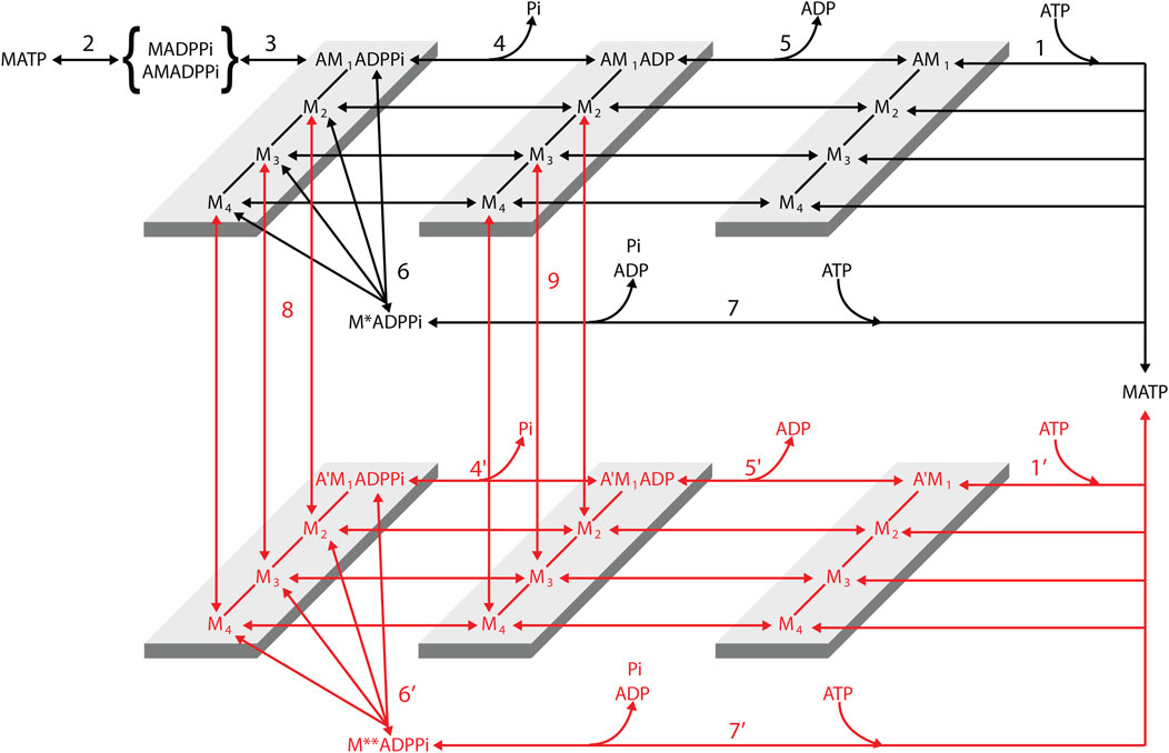Figure 12. Structurally and chemically explicit cycle of the myosin motor integrating the properties of the three preceding schemes (Reaction Scheme 4). Transitions shown in black indicate the cycle undergone by myosin motors (M) that interact with only one actin monomer (A). Transitions shown in red indicate the cycle undergone by myosin motors slipping to the next actin monomer 5.5 nm away from the center of the sarcomere (A′). For simplicity, this legend is mostly limited to black transitions. M1–M4 represent the structural states defining the progression of the working stroke in a given biochemical state of the attached myosin motor. Binding of an ATP molecule induces dissociation of the myosin motor from actin (step 1, 1′), which is followed by the recovery of the conformation of the motor at the beginning of the working stroke and the hydrolysis step (step 2). The MADPPi–AMADPPi state represents both the detached motor just after the hydrolysis step and recovery stroke and the weakly actin-bound motor with the hydrolysis products still bound. Strong binding of M to an actin monomer A (step 3) implies the formation of the first of four different force-generating states, AM1ADPPi, which, without significant delay, undergoes the structural transition, leading to the strained conformation responsible for the isometric force. The working stroke, in any of the biochemical states, AMADPPi, AMADP, and AM, implies three subsequent force-generating steps (M1→ M2, M2→ M3, and M3→ M4) controlled by strain-dependent rate constants (Huxley and Simmons, 1971). Both biochemical events in the attached motor, release of Pi (step 4, 4′) and release of ADP (step 5, 5′), can occur in any of the four structural states. Unconventional pathways are represented by the possibility of the force-generating AMADPPi state to detach (step 6, 6′) and rapidly release the hydrolysis products and rebind ATP (step 7, 7′) and the possibility that during shortening, the motor attached to the first actin monomer (A) slips to the next Z-ward actin monomer (A′, steps 8 and 9). This possibility is specifically relevant to the AMADP state (step 9; see the rate functions listed in Supplementary Table 1). Reproduced from Figure 1 in Caremani et al. (2015) with permission.