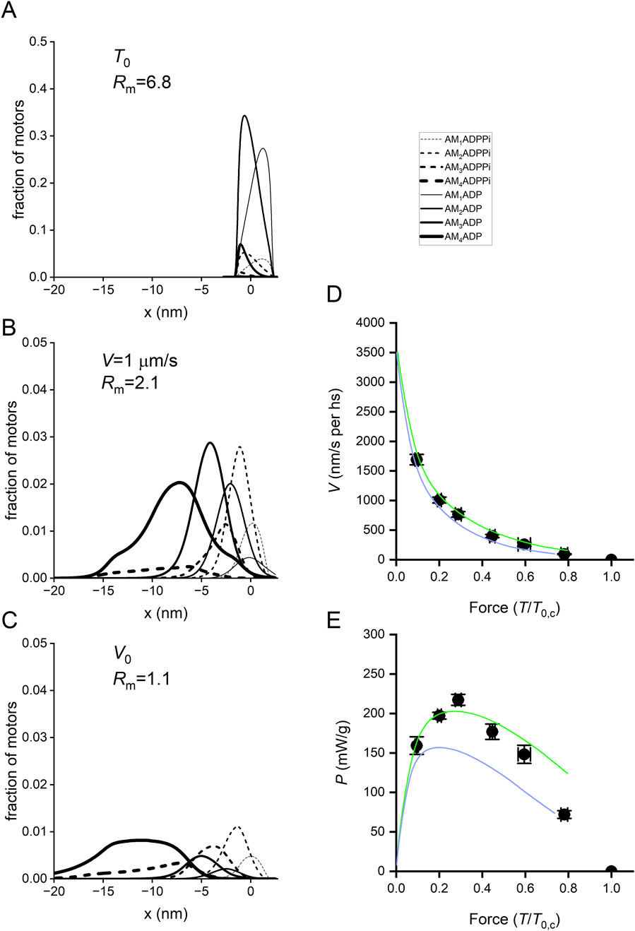 Figure 13. x-distribution of the attached states in isometric contraction and during shortening and simulation of the force–velocity and power–force relations with Reaction Scheme 4. (A-C) x-distribution of the attached states in isometric contraction and during shortening. Dashed lines, AMADPPi states; continuous lines, AMADP states. Progression of states through the working stroke identified by the progression from the thinnest to the thickest line, as indicated in the inset. (A) Distribution at T0. Rm, the ratio between AMADP and AMADPPi motors, is ∼7. (B). Distribution during isotonic shortening at V = 1,000 nm/s per hs, Rm is ∼2. (C). Distribution at V0, Rm is ∼1. (D) T–V relations. Circles, experimental data; lines, simulated relations with Reaction Scheme 4 with (green) and without (violet) steps 8 and 9. (E) P–T relations calculated from T–V relations in (D). Circles and lines, same codes as in (D).