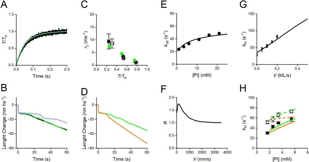 A consequence of the idea that the release of Pi is orthogonal to the working stroke transitions is that only the kinetics of the working stroke is strain-dependent. Instead, Pi-release kinetics is sensitive to the structural state of the attached motor (conformation-dependent) and, thus, indirectly connected to the mechanical conditions by the speed of the progression through the different conformations (M1–M4). Under these conditions, the model satisfies the constraints that the speed of the working stroke (the rate of phase-2 rapid shortening, r2) elicited by a stepwise force decrease (i) increases with the size of the step (Figure 14C: filled symbols: black, experiment; green, model) and (ii) is not affected by the increase in [Pi] (Figure 14C; open symbols: black, experiment; green, model).