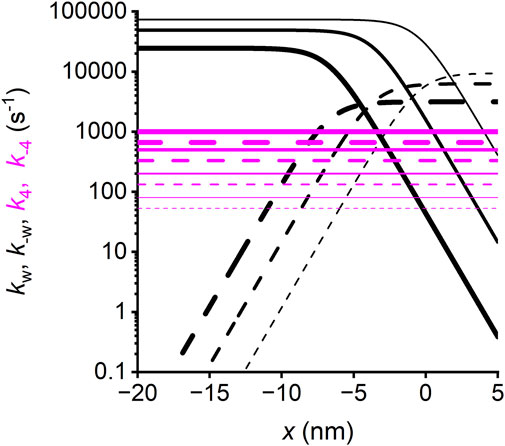 Figure 15. Strain-dependence of the rate constants of the working stroke transitions and Pi release. Forward transitions, continuous lines; backward transitions, dashed lines. Black, working stroke transitions; line thickness increases with the progression of the transition from the first (M1–M2, the thinnest line) to the third (M3–M4, the thickest line). Magenta, Pi release step; line thickness increases with the progression of motor conformation from M1 (the thinnest line) to M4 (the thickest line). For simplicity, the transitions considered are those concerning the myosin motor while attached to the first actin monomer A (and the slip to the next actin monomer A′, 5.5 nm away from the sarcomere center can be deduced by shifting the rate functions for A leftward by 5.5 nm).