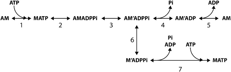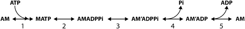 Scheme 2. 5 step reaction scheme integrated by a branched pathway accounting for the detachment from a strong bound AM'ADPPi state followed by release of hydrolysis products.