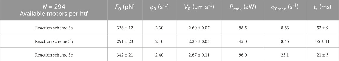 Table 1. Simulations of the relevant mechanical and energetic parameters of the half-thick filament with Reaction Scheme 3a (integral version of the model shown in Figure 10), Reaction Scheme 3b (slipping suppressed), and Reaction Scheme 3c (slipping surrogated by ad hoc increase of the attachment–detachment kinetics). F0, steady isometric force per half-thick filament; φ0, steady isometric ATPase rate per myosin motor; V0, unloaded shortening velocity; Pmax, maximum power; φPmax, ATPase rate at Pmax; tr, rise time of isometric force development. Reaction Scheme 3a implies the possibility of the attached motor in state A2 to slip to the next Z-ward actin site. Reaction Scheme 3b retains the same kinetic scheme as Reaction Scheme 3a but excludes the possibility of slipping. In Reaction Scheme 3c, the attachment and detachment rate constants are increased to fit the observed F–V relation and P–F relation as shown in Figure 10. Data are presented as the mean ± SEM from at least 12 simulations. Table from Pertici et al. (2023).