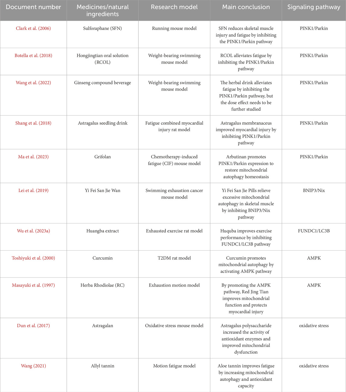 Multiple studies demonstrate that natural compounds and drugs modulate the PINK1/Parkin-mediated mitophagy pathway. Sulforaphane (SFN)-exhibiting antioxidant (Ma et al., 2023), anticancer (Kamal et al., 2020), anti-aging (Santín-Márquez et al., 2019), and antiviral (Ordonez et al., 2022) properties. Rhodiola crenulata, a Tibetan Crassulaceae plant, contains the primary active compound kaempferol with anti-inflammatory (Pu et al., 2020), neuroprotective (Zhang et al., 2019), radioprotective (Arora et al., 2005), and anticancer effects (Ravi et al., 2025). Guo et al., (2022) and Hou et al. (2020) investigated SFN and Rhodiola crenulata oral liquid effects on PINK1/Parkin signaling, exercise-induced mitophagy, and skeletal muscle fatigue. Despite different exercise models-treadmill vs. and weighted swimming, both studies reported reduced skeletal muscle damage, enhanced antioxidant capacity. Hou et al. additionally measured total antioxidant capacity and Na+-K+-ATPase activity, and attenuated fatigue through PINK1/Parkin-mediated mitophagy inhibition. Wang et al. (2023) subsequently found that a ginseng compound formula similarly inhibits PINK1/Parkin-mediated mitophagy to influence fatigue. Unlike prior studies, Wang et al. observed dose-dependent effects on loaded swimming time, 4.16 and 16.66 mL/kg doses significantly prolonged swimming versus controls, while 8.33 mL/kg showed no statistical difference-warranting further investigation into this anomalous result. Yuan et al. (2022) employed a fatigue-with-myocardial-injury model investigated Astragalus Shengmai Decoction-derived from Shengmai Powder and containing Astragalus, Codonopsis, Ophiopogon, Schisandra, and Southern Schisandra-which tonifies Qi, restores pulse rhythm, nourishes Yin, and promotes fluid production, enhancing myocardial hypoxia tolerance while reducing oxygen consumption (Qu and Hao, 2017; Jiang et al., 2021), confirmed Astragalus Shengmai Decoction’s inhibitory effect on PINK1/Parkin expression.
