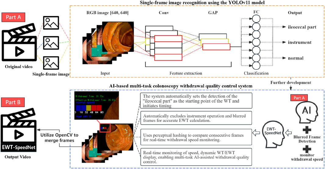 Therefore, this study aims to develop an AI-assisted, multitask colonoscopy withdrawal quality control system based on convolutional neural networks (CNN). The system is designed to achieve real-time, synchronized monitoring and visual feedback of withdrawal speed, WT, and EWT, thereby promoting procedural standardization, optimizing workflow, and ultimately improving adenoma detection rates while reducing the risk of missed colorectal cancers.