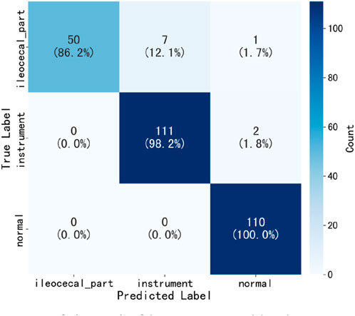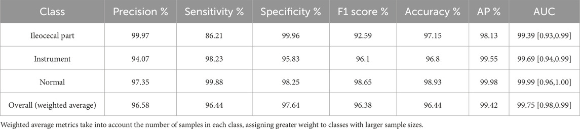 Table 2 presents the performance of the best-performing model, YOLOv11 m, on 281 test images, including precision, sensitivity, specificity, F1 score, accuracy, average precision (AP), and AUC values for the three classes, along with a weighted average as a summary metric. Figure 6 shows the confusion matrix of the YOLOv11 m model, illustrating the distribution of predictions across all classes. The model achieved an inference speed of 86.78 FPS on the test set. Figure 7 further illustrates key evaluation curves of the YOLOv11m model: Figure 7A shows the ROC curves, with all class-specific curves closely approaching the top-left corner, indicating excellent classification performance; Figure 7B displays the precision-recall (PR) curves, where curves approaching the top-right corner reflect superior detection capabilities. Figure 8 presents Grad-CAM–based visualizations of the model's decision-making process. Figures 8A,D correspond to the ileocecal part and instrument operation categories, respectively. Figures 8B,C show activation heatmaps and overlay results for the ileocecal region, while Figures 8E,F illustrate the corresponding heatmaps and overlays for instrument operation frames. Warm-colored areas (such as red and yellow) highlight the critical lesion regions the model focused on. These visualizations help clinicians intuitively verify whether the model is focusing on medically relevant areas, which can build trust in its predictions and support clinical acceptance. For instance, in the ileocecal part category, Grad-CAM heatmaps consistently focused on the ileocecal valve—an important anatomical landmark used by endoscopists to confirm successful cecal intubation. This clear alignment between model attention and clinical reasoning further enhances trust and supports real-time clinical decisions.