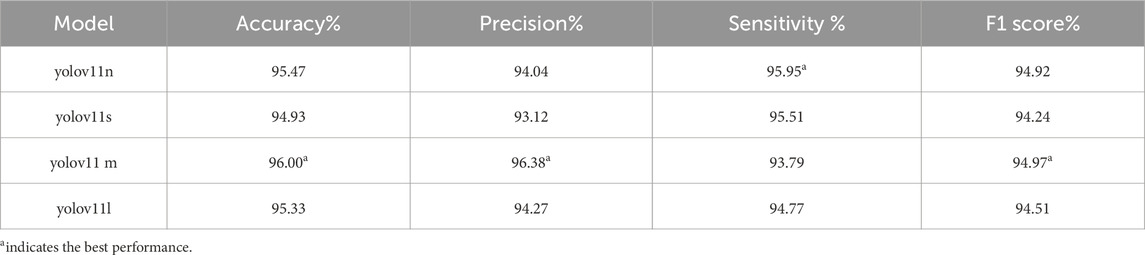 This study adopted a transfer learning strategy (Shin et al., 2016), utilizing four variants of the YOLOv11 model (nano, small, medium, and large) pre-trained on ImageNet (Khanam and Hussain, 2024), and fine-tuned all layers using the study-specific dataset. The training configuration included automatic optimizer selection, dynamic learning rate adjustment, a maximum of 100 training epochs, and a batch size of 32. Evaluation metrics comprised accuracy, precision, recall, and F1 score. Training was accelerated using automatic mixed precision on GPU devices, with an early stopping strategy (patience = 8) employed to prevent overfitting. All training procedures were implemented using the PyTorch framework. To ensure model robustness and practical applicability, the performance of the four YOLOv11 variants was compared, and the best-performing model was selected.