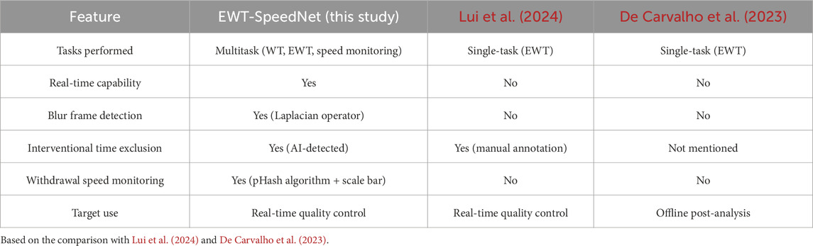 To further contextualize the strengths and innovations of our system, Table 3 provides a comparative summary of EWT-SpeedNet with two representative AI-based systems previously proposed by Lui et al. (2024) and De Carvalho et al. (2023). The comparison highlights major differences in task coverage, real-time capabilities, withdrawal speed monitoring, and intended clinical application.