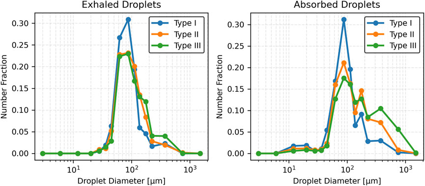 Figure 5 shows the number fraction of exhaled and absorbed droplets across size ranges. The Type I mucus (healthy condition) yields the highest peak number fraction, particularly in the 75–100 µm range. Conversely, the Type II and Type III (disease conditions) show broader distributions with reduced peaks and a greater prevalence of larger droplets (>125 µm). Notably, droplets exceeding 200 µm become prominent in the Type III (advanced thickening) case. This reinforces the observed trend that thicker mucus (more severe disease) shifts the distribution toward larger droplet sizes, while thinner mucus (less severe disease) concentrates droplets in a narrower mid-size range.