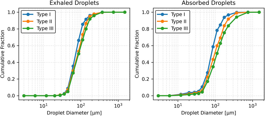 Figure 6 presents cumulative distributions for both exhaled and absorbed droplets. The curve for Type I mucus (healthy condition) rises steeply and plateaus early, reflecting the dominance of smaller droplets (<100 µm). In contrast, Type II and Type III (disease conditions) curves rise more gradually and extend to larger sizes, particularly for Type III, which skews heavily toward >125 µm. Absorbed droplet distributions follow similar trajectories, with thicker mucus associated with a slower, broader rise—indicating retention of a higher proportion of large droplets.