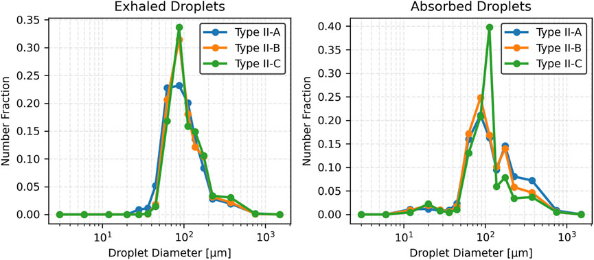 Figure 8 illustrates the number fraction of exhaled and absorbed droplets for the three viscosity values considered. For Type II-A (baseline viscosity), the distribution peaks in the 75–100 µm range, indicating a concentration of mid-sized droplets. In comparison, Type II-B (moderate viscosity) and Type II-C (high viscosity) show slightly broader distributions, also peaking in the 75–100 µm range. Notably, Type II-C produces a greater proportion of larger droplets (>125 µm) than the baseline. Droplets exceeding 500 µm remain rare across all conditions. For absorbed droplets, Type II-A also peaks at 75–100 µm but exhibits a notable presence of larger droplets in the 150–200 µm range. Type II-B and Type II-C follow similar patterns, with peak probabilities also in the 75–100 µm range. However, Type II-C shows an increased probability in the 100–125 µm range, indicating a viscosity-dependent shift toward larger absorbed droplets. Larger droplets (>250 µm) are more prominent in the absorbed droplet distributions, especially for Type II-A.