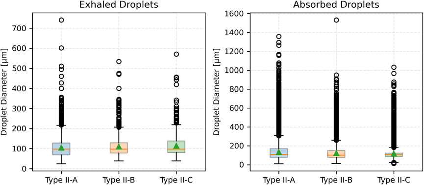 Figure 10 displays box plots of droplet diameters for both exhaled and absorbed droplets. For exhaled droplets, the median size increases slightly with viscosity from Type II-A to Type II-C, with greater variability. In contrast, absorbed droplets consistently have larger median sizes, increasing from Type II-A to Type II-C. These droplets exhibit larger variability, with wider interquartile ranges and more outliers, particularly for Type II-A. Exhaled droplets under lower viscosity maintain narrower size distributions, reflecting uniform formation of smaller droplets in those cases.