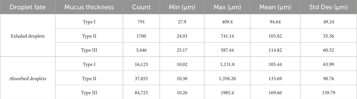 Absorbed droplets—those redepositing into the mucus layer—follow a similar trend to exhaled droplets. Thicker mucus produces more absorbed droplets and larger mean sizes, with a notable proportion of droplets exceeding 200 µm in Type III. No absorption occurs for droplets below 10 µm (Table 2). Compared to exhaled droplets, absorbed droplets are consistently greater in number and exhibit larger mean sizes across all mucus conditions. Thus, increasing mucus thickness consistently results in higher droplet counts and larger droplet sizes for both exhaled and absorbed droplets.