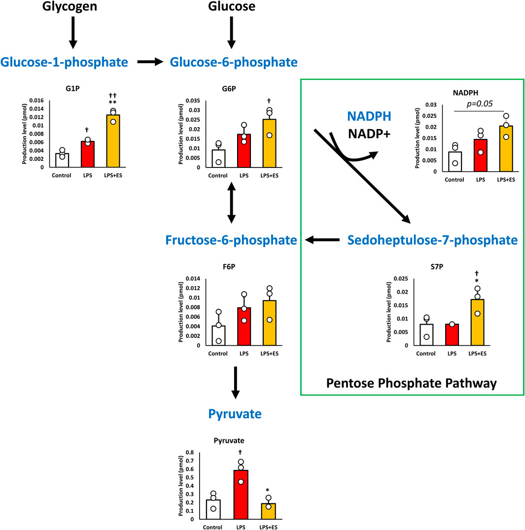 Figure 1. ES enhances glycolytic pathway and PPP. These results present the ratios of the control group. LPS increased G1P, and Pyruvate level (p < 0.05, vs. control group) while ES further increased G6P level (p < 0.05, vs. Control group), but pyruvate level was similar to the control by ES. Moreover, ES increased NADPH level (p = 0.05 vs. Control group) and S7P level (p < 0.05, vs. control and LPS groups). Statistical differences among the groups were analyzed using the Tukey-Kramer test. n = 3 for per group. **p < 0.01, *p < 0.05 vs. LPS group; † † p < 0.01, † p < 0.05 vs. control group.