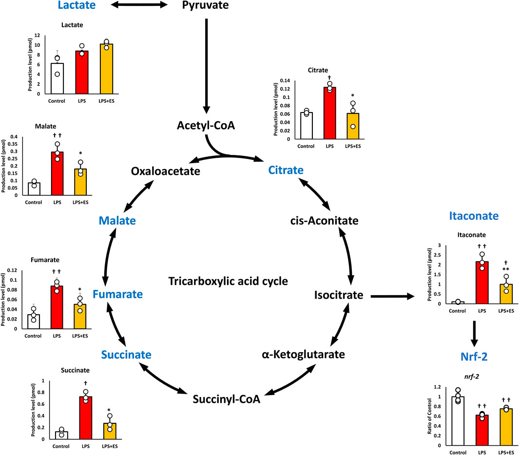 Pyruvate is metabolized to lactate or acetyl CoA, and the TCA cycle is initiated from acetyl CoA. LPS significantly increased both metabolites of the TCA cycle, but ES decreased the increased production by LPS. Itaconate, which is metabolized from isocitrate, activates NRF-2 and exerts an anti-inflammatory effect, but its level was decreased after ES, even though itaconate level was increased by LPS stimulation. However, Nrf-2 expression was decreased after both LPS and ES stimulation compared to the control group, suggesting that the anti-inflammatory effect of ES was not mediated by itaconate.
