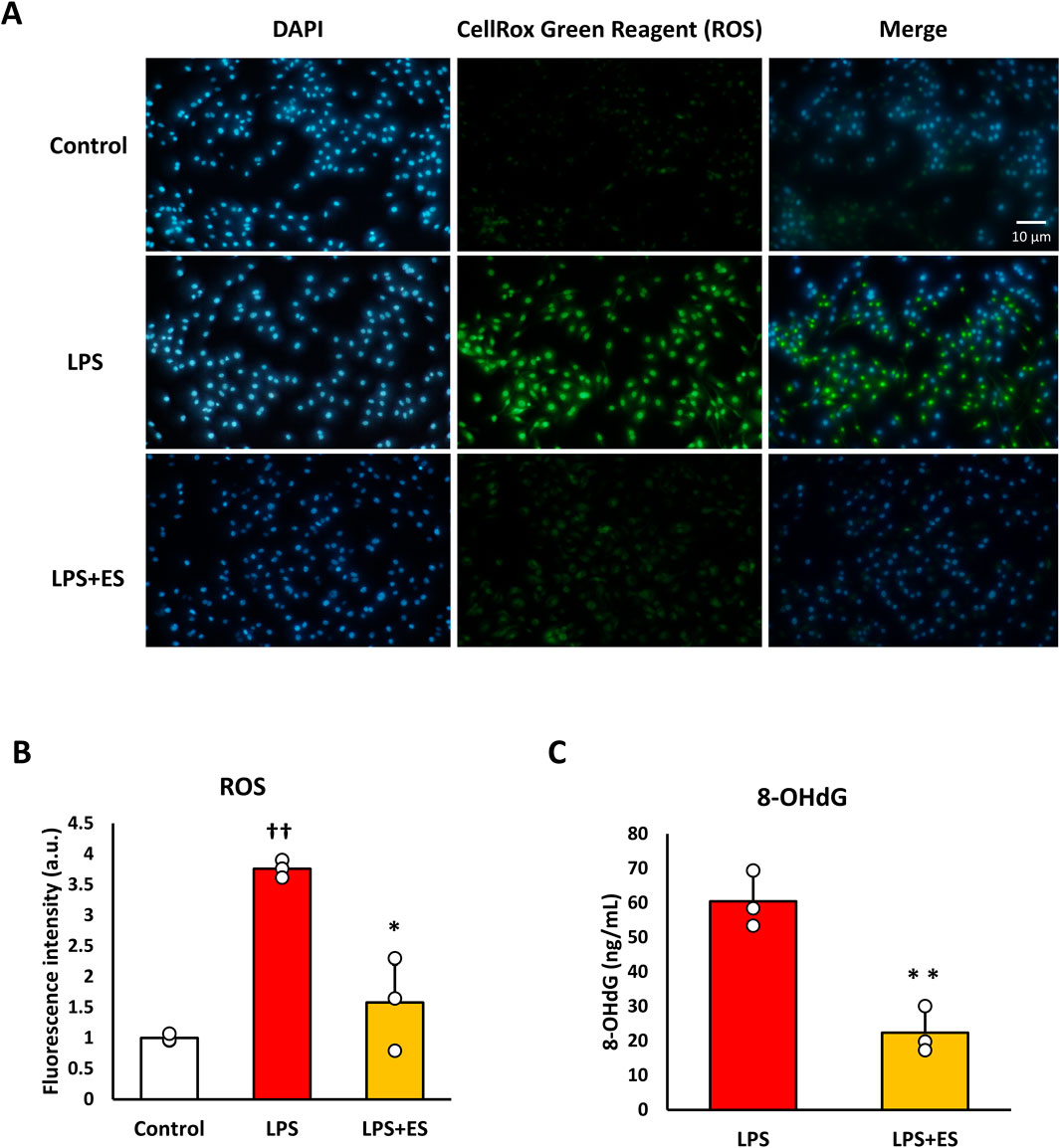 Figure 3. ES suppresses ROS and 8-OHdG production induced by LPS stimulation. (A) BMDMs were stained with DAPI or CellRox Green Reagent. LPS-stimulated BMDMs were stained, with fluorescence intensities observed in the control group (higher), the LPS group (middle), and the LPS+ES group (lower). Blue indicates DAPI staining, and green represents ROS. (B) The fluorescence intensities for each group were quantified using ImageJ and compared to the control group. The intensity in the LPS group was significantly higher than that of the control group (p < 0.01). The LPS+ES group showed a significant suppression of intensity compared to the LPS group (p < 0.05). (C) ES also significantly decreased 8-OHdG level in LPS stimulated macrophages. The 8-OHdG level in the control group was below the detection limit and therefore not displayed. Statistical differences among the groups were analyzed using the Tukey-Kramer test or student-t test. n = 3 per group. **p < 0.01, *p < 0.05 vs. LPS group, † † p < 0.01 vs. control group. Data are presented as the mean ± SD.