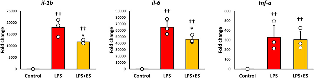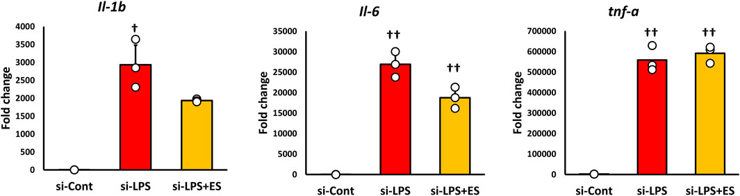 Figure 4. ES suppresses Il-1b and Il-6 expression induced by LPS stimulation. These results represent the ratios in the control group. LPS stimulation significantly increased inflammatory cytokines expression (p < 0.01, vs. control group). ES significantly decreased Il-1b and Il-6 mRNA expressions elevated by LPS (p < 0.05, vs. LPS group), however, Tnf-a mRNA expression was not decreased by ES. The statistical differences between these groups were tested by Tukey-Kramer test. n = 3 per group. *p < 0.05, vs. LPS group, and † † p < 0.01, vs. control group. Data are presented as mean ± SD.