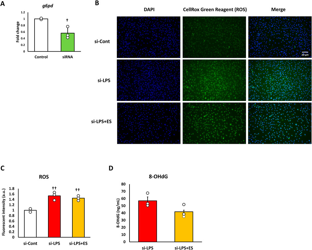 Figure 5. ES does not suppress ROS production or oxidative stress in G6PD-knockdown BMDMs after LPS stimulation. (A) G6pd mRNA expression was reduced to half that of the control group. This result indicates that G6pd was effectively knocked down in siRNA-transfected BMDMs. Statistical differences between the control and siRNA groups were tested using Student’s t-test. n = 3 for per group. † p < 0.05, vs. control group Data are presented as mean ± SD. (B) G6PD knockdown-BMDMs were stained with DAPI or CellRox Green Reagent. LPS-stimulated BMDMs were stained, with fluorescence intensities observed in the si-control group (higher), the si-LPS group (middle), and the si-LPS+ES group (lower). (C) The fluorescence intensities for each group were quantified using ImageJ and compared to the si-control group. The fluorescent intensity was significantly increased by LPS stimulation, and it was maintained after ES (p < 0.05, vs. si-control group). (D) ES also did not reduce the 8-OHdG level in LPS-stimulated macrophages. The 8-OHdG level in the control group was below the detection limit and therefore not displayed. The statistical differences between these groups were tested by Tukey-Kramer test. n = 3 per group. †† p < 0.01, vs. control group. Data are presented as mean ± SD.