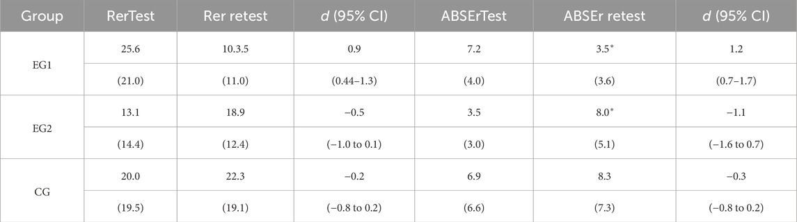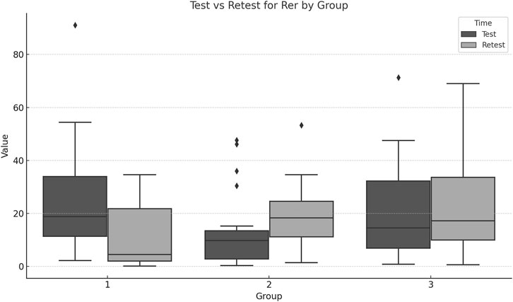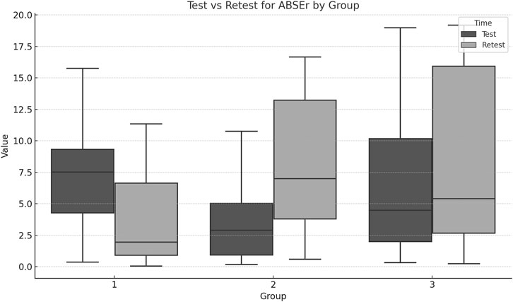 Significant group differences were found for Retest_REr (F = 6.75, p = 0.012) and Retest_ABSEr (F = 7.34, p = 0.009). The repeated measures MANOVA showed significant differences in the multivariate profiles across groups and over time. Comparing Test and Retest values for each group indicates whether performance or the measured outcome changed significantly over time (Figures 4, 5; Table 3).