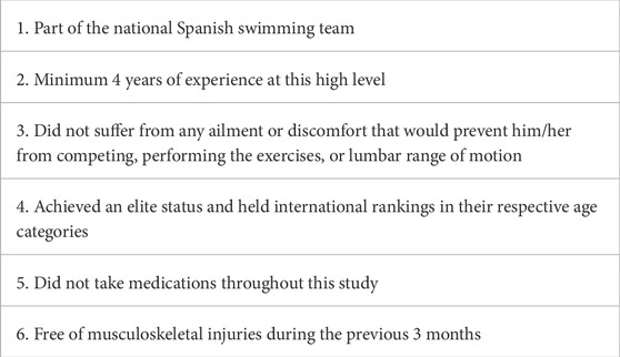 Lumbar joint position sense (JPS) was assessed using a twin-axis electrogoniometer (Transducer TSD130A, Biopac Systems, Inc., Goleta, California, United States), which was integrated with a computer and Acknowledge 3.0.9 software (Biopac Systems, Inc., Goleta, California, United States) Lumbar flexion, extension, and total ROM degrees were measured. The equipment was calibrated prior to each testing day to determine the 0° and 90° of each frontal and sagittal plane, but only the sagittal data were analyzed as is the plane of movement of undulatory underwater swimming (UUS). The cranial arm of the goniometer was placed over the D11 and D12 spinal processes, while the lower arm was placed over the sacrum. Therefore, flexion movements were associated with positive degrees, and extension movements were associated with negative degrees. Lumbar ROM scores were obtained by summing the mean flexion degrees and the mean absolute extension degrees collected in each trial.