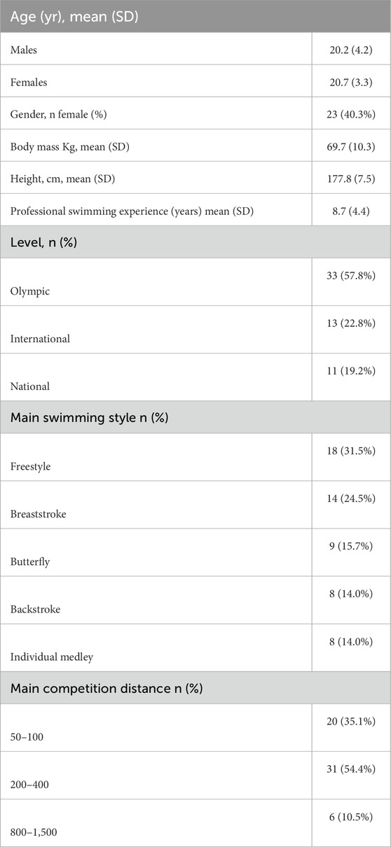 A total of 78 professional swimmers were initially recruited and randomly assigned to three groups (EG1, EG2, and CG), with 26 participants per group. This sample size was determined through an a priori power analysis using G*Power 3.1(Bonn FRG, University of Bonn, Department of Psychology), assuming a large effect size (f = 0.4), α = 0.05, and a desired power (1−β) of 0.80 for repeated-measures ANOVA. Anticipating possible dropouts, we recruited a larger initial sample. Ultimately, 57 swimmers completed the study (Figure 1). A post hoc power analysis based on the observed partial η2 = 0.108 (f ≈ 0.35) revealed that the final sample size maintained sufficient statistical power (1−β = 0.81) to detect group × time interaction effects. They were recruited from the Spanish national swimming team. All participants met the inclusion criteria (Table 1) and were informed, in writing and verbally, about the procedures of this study prior to the assessment day.