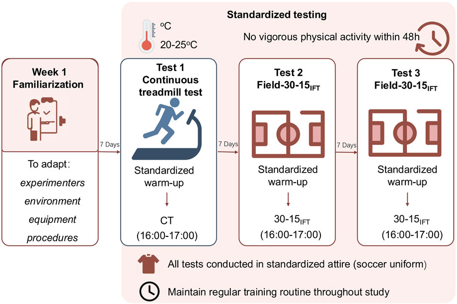 This study employed a repeated-measures design. A week before the main experimental protocol, participants had one habituation session to familiarize themselves with the experimenter, laboratory, materials, and exercise test to minimize the learning effect and ensure exercise test reliability. All three test sessions were conducted at the same time of day (between 4:00 p.m. and 5:00 p.m.), with a 7-day interval between each session. The first session was conducted in a laboratory setting using a motorized treadmill to determine maximal oxygen uptake (VO2max) and maximal heart rate (HRmax) as reference measures. The second and third sessions were conducted on an outdoor grass field where the participants normally trained, using the 30-15 Intermittent Fitness Test (30-15IFT) as the test protocol. On each testing day, participants wore their standard soccer match apparel and completed a standardized warm-up before the 30-15IFT, which included 5–10 min of moderate-intensity jogging followed by 5 min of static and dynamic stretching. To minimize the impact of fatigue, all participants were instructed to refrain from engaging in any vigorous physical activity for at least 48 h before each test session. Throughout the study period, participants maintained their regular training routines. All tests were performed under similar environmental conditions, with ambient temperatures ranging from 20 °C to 25 °C, to ensure consistency across sessions. The simplified experimental protocol is shown in Figure 1.