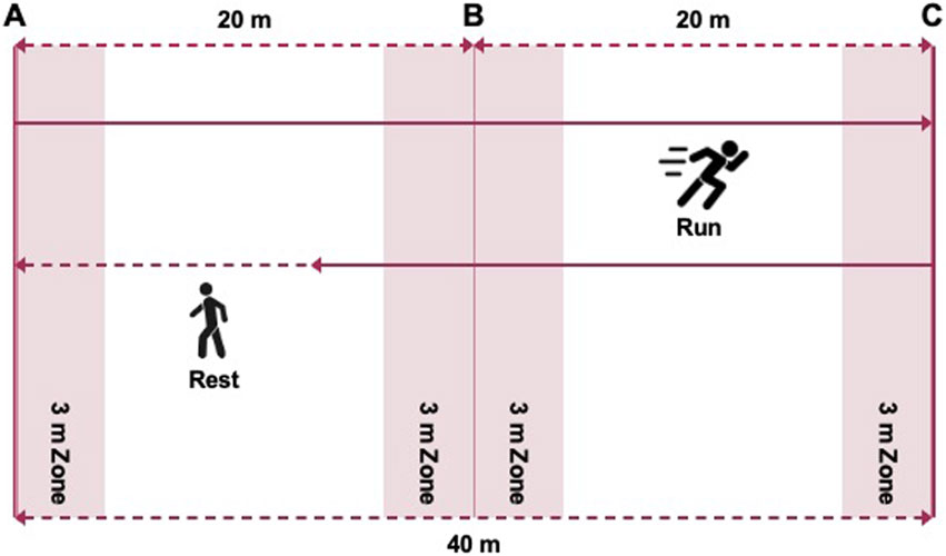 The 30-15 Intermittent Fitness Test (30-15IFT) was administered according to the protocol described by Buchheit (2008). The course design for the 30-15IFT is shown in Figure 2. The test consists of alternating 30-s shuttle runs and 15-s passive recovery periods. Participants followed a pre-recorded audio cue (APP: 30-15IFT) and started running from marker line A at 8 km/h, increasing the speed by 0.5 km/h per level. They ran back and forth between two lines 40 m apart at a certain speed during the 30 s of exercise, followed by a 15-s recovery period to walk back to within the nearest 3-m zone and the nearest marker line (A/B/C), after which the next level of testing began. Participants were encouraged to complete as many stages as possible. The test was terminated when any of the following criteria were met: (1) voluntary cessation by the participant, or (2) failure to reach the 3-m buffer zone before the audio signal on three consecutive occasions. The final completed stage speed was recorded as the participant’s maximal intermittent running speed (VIFT). Maximal oxygen uptake in 30-15IFT (VO2max-IFT, in ml·min-1·kg-1) was estimated using Buchheit’s predictive equation (2008): VO2max-IFT = 28.3–(2.15 × gender)–(0.741 × age)–(0.0357 × body mass) + (0.0586 × age × VIFT) + (1.03 × VIFT) where gender was coded as 1 for males and 2 for females. Participants’ heart rates in 30-15IFT (HRmax-IFT) were measured throughout the 30-15IFT using the Polar Team Pro System (Polar Team Pro System, Polar Electro, Kempele, Finland).