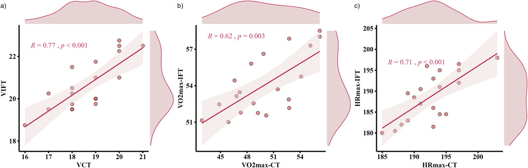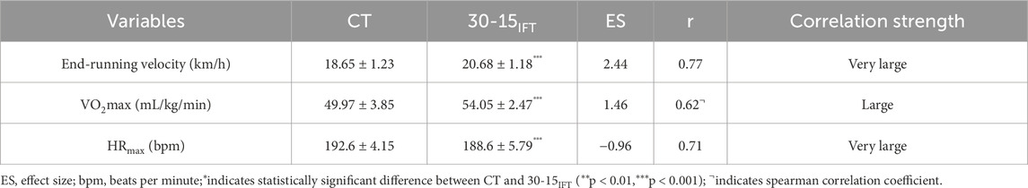 Figures 3–5 shows the results of the 30-15IFT validity analyses for each indicator. The correlation analyses demonstrated criterion validity (Table 3), as evidenced by a large correlation between the 30-15IFT and CT for VO2max (r = 0.62, p = 0.003) and a very large correlation between HRmax and end-running velocity (r = 0.71–0.77, p < 0.001). However, all variables in 30-15IFT had moderate to very large differences compared to CT (ES = −0.96–2.44). This indicates that despite the strong correlations, a systematic bias exists, with the 30-15IFT consistently overestimating physiological capacity and underestimating maximal heart rate relative to the gold-standard test.