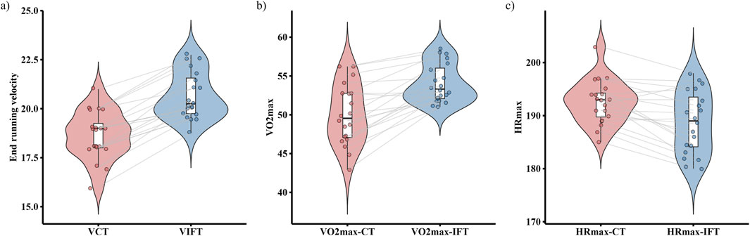 Figure 4. Differences between continuous running treadmill test (CT) and the 30-15IFT for: (a) End-Running Velocity; (b) VO2max, and (c) HRmax.