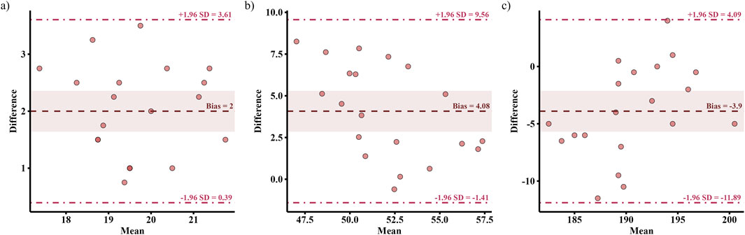 Bland-Altman plots (Figure 6) present the limits of agreement between the 30-15IFT and the CT. The 30-15IFT overestimated end-running velocity by 2.0 km/h (95% LoA: 0.39–3.61 km/h) and VO2max by 4.08 mL/kg/min (95% LoA: −1.41–9.56 mL/kg/min) compared to the CT. Conversely, HRmax was underestimated by an average of −3.9 bpm (95% LoA: −11.89 to 4.09 bpm).