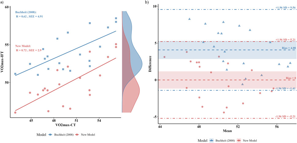 Figure 6. Comparative analysis of the predictive accuracy and agreement for the new population-specific model and the general Buchheit (2008) equation. (a) Predicted versus criterion VO2max. (b) Bland-Altman plots with 95% limits of agreement between the continuous running treadmill test (CT).
