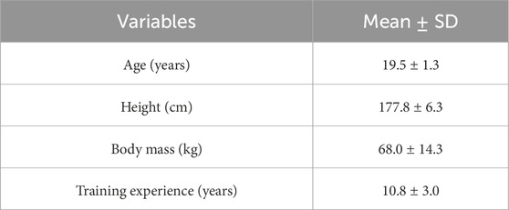 Twenty male well-trained collegiate soccer players (Table 1) volunteered to participate in this study. All participants are from the Central South University soccer team and have performed well in the China University Football Association (CUFA), winning multiple provincial championships. The players trained 5.5 ± 1.2 times per week (11.8 ± 2.1 h per week) and testing took place during the competitive season. Goalkeepers were excluded due to aerobic capacity differences in soccer positions (Nobari et al., 2021). All players were free from cardiovascular or respiratory disease and had no injuries at the time of testing. The study was approved by the Ethics Committee of the Wuhan Sport University according to the Helsinki Declaration guidelines. Participants were fully informed and signed a consent form that indicated they could withdraw from the study at any time.